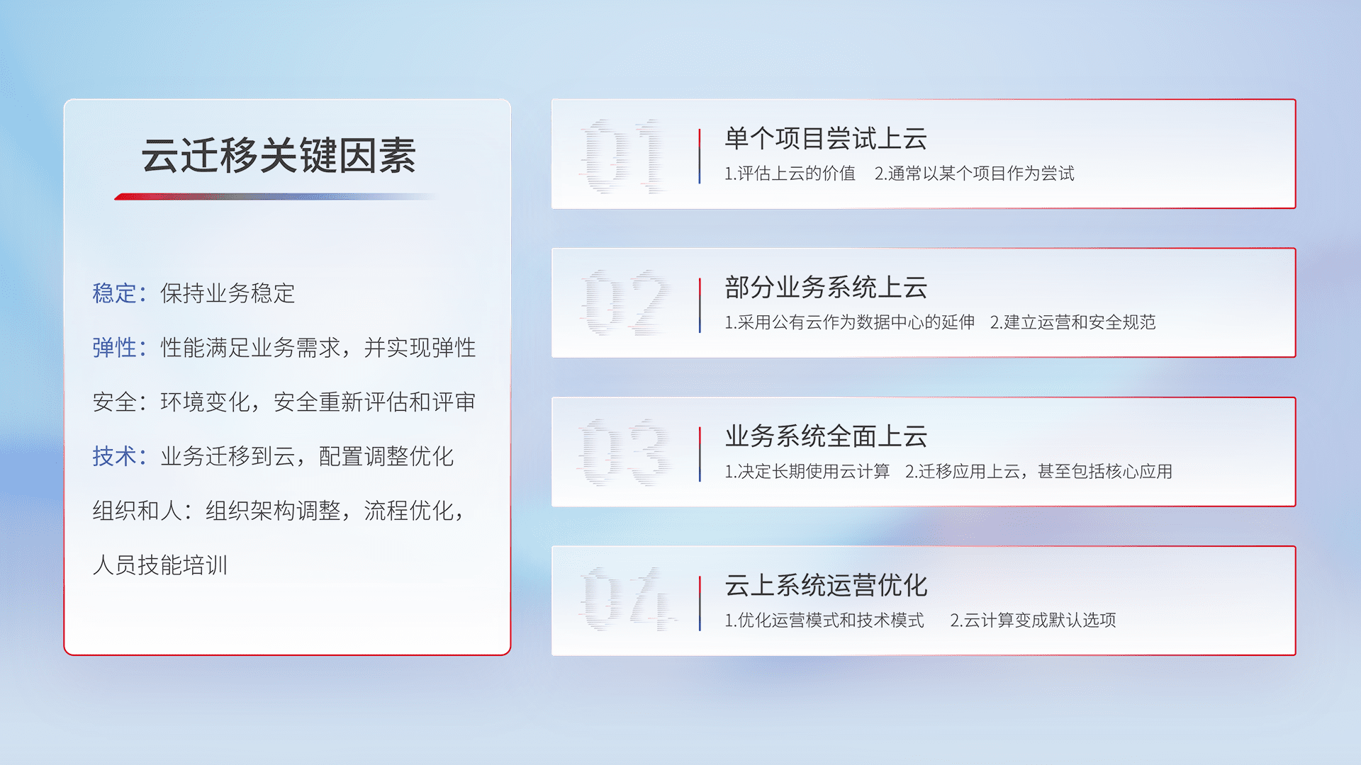 结合实际业务,,,从规划设计、、云平台选型、、云原生改造、、数据迁移、、、、集成交付,,,迁移全过程为客户识别最佳上云路径,,,,做好风险识别管理,,,,设计网络架构、、、、身份权限、、、、安全审计合规、、、操作审计、、日志审计、、监控告警策略、、、多站点容灾设计等,,对云上基础设施进行整体规划,,,,提升IT治理水平,,,以满足弹性、、高可用、、高性能的需求。。