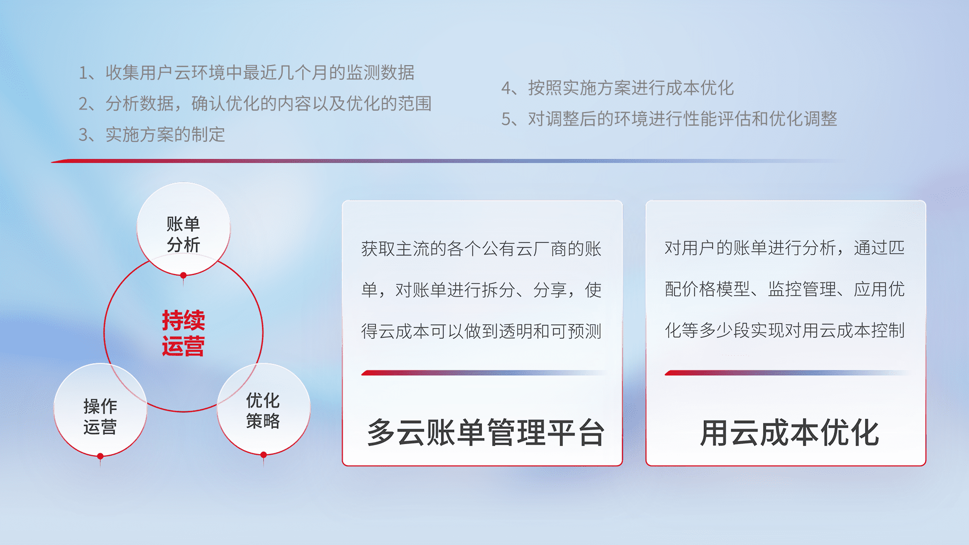 通过多云纳管,,以统一的资源数据模型把客户的云资源进行抽象和封装,,,进而实现对多云资源的统一操作,,,,保障云资源管理的可靠性、、、、稳定性与可用性。。。。量身定制化运维内容,,配置、、开发运维、、、、补丁管理、、、、备份、、、、监控、、、认证和访问管理、、、审计和日常巡检等,,保障在用云过程中的可靠度,,,,稳定度以及高可用率。。